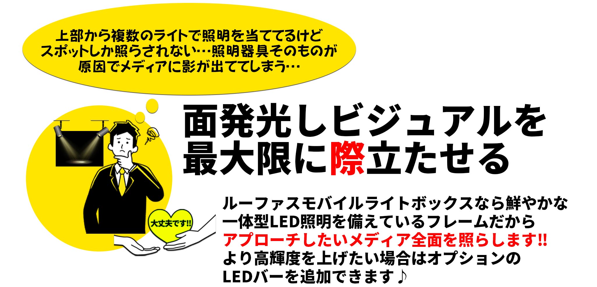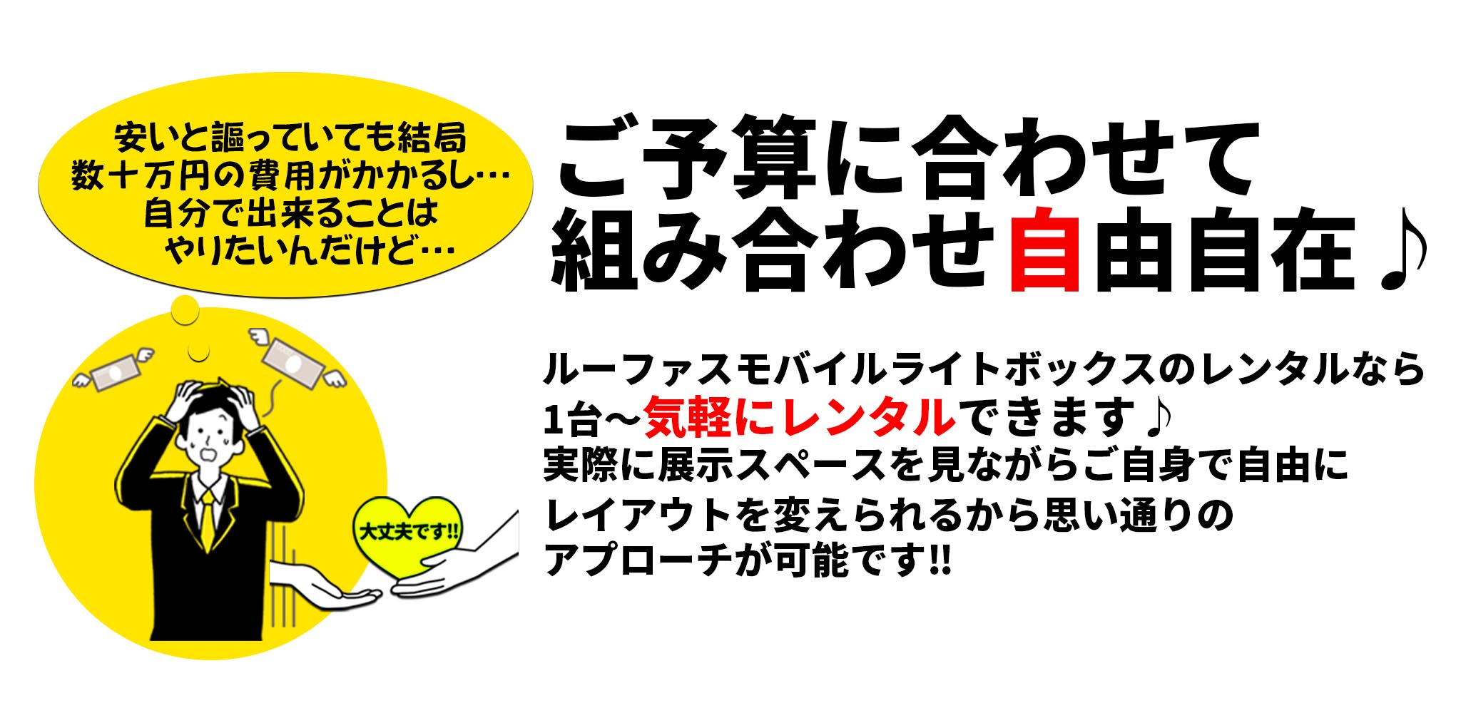 突発的なプロジェクトなどに合わせて必要な時にさまざまな場所でインパクトのあるプロモーションをスピーディーに調達できるのがルーファスモバイルレンタル! 搬入設置・搬出もお任せください!