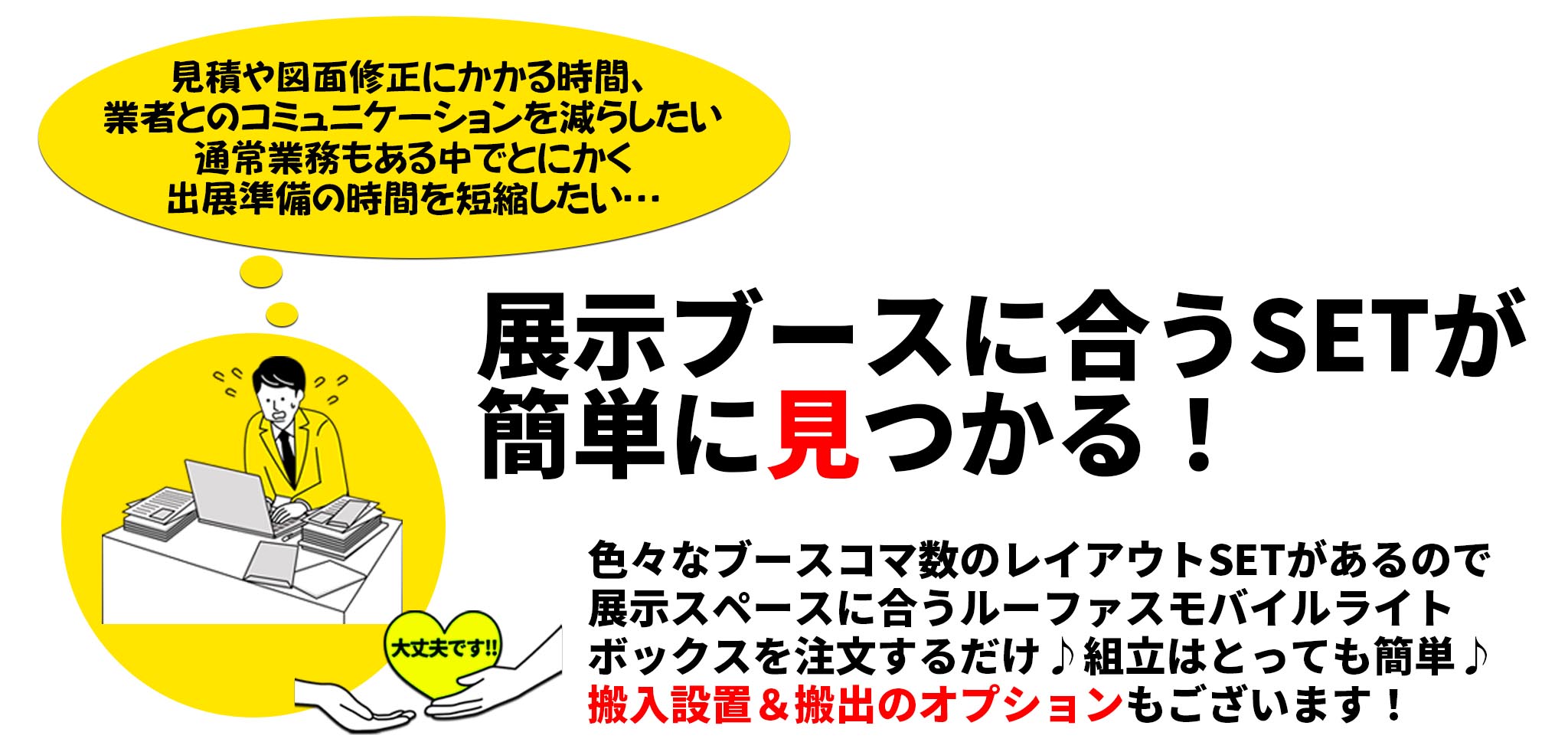 お客様にはブース装飾準備の工数削減によって生み出された時間を有効活用してもらいたい。