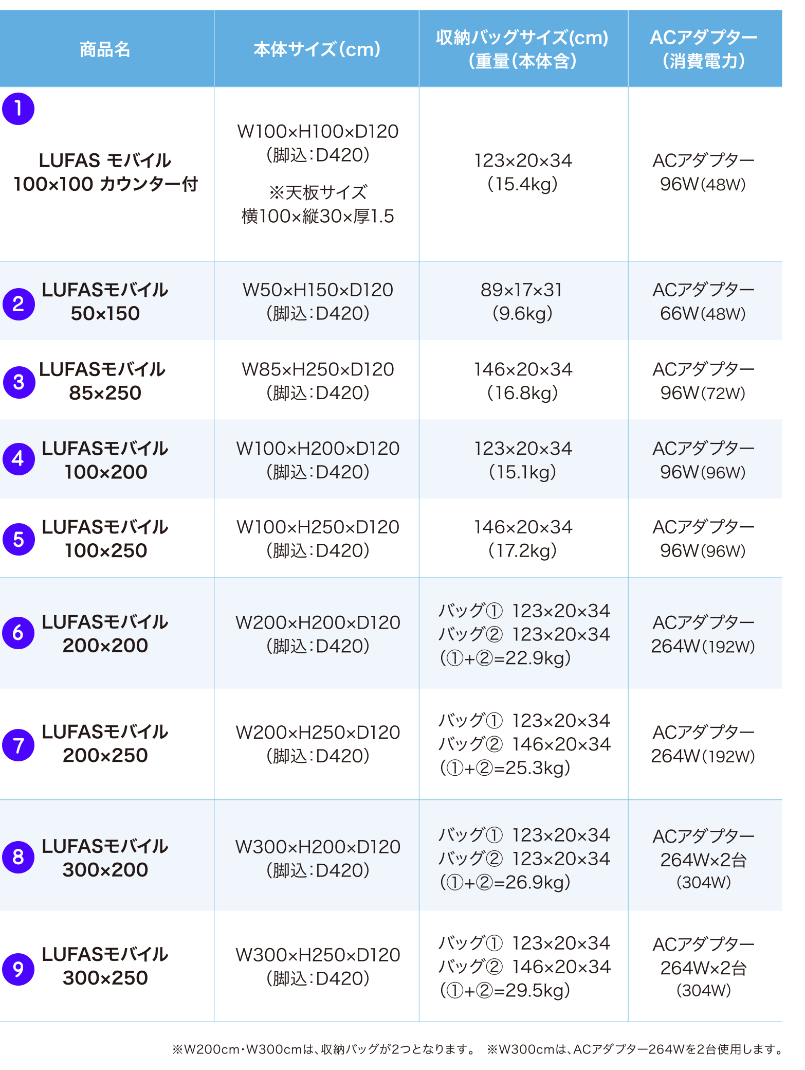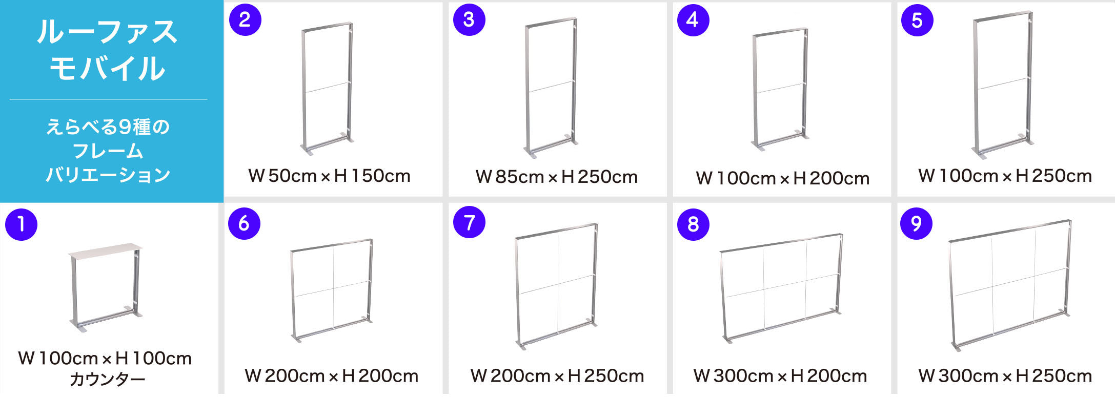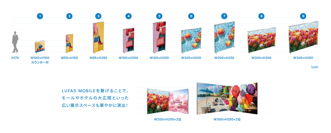 厳選したサイズのラインナップから、様々な展示スペースに応じた展開が可能です。小さくコンパクトな省スペースはもちろんのこと、最大3メートルのフレームやアクセサリーパーツのコネクタを使用して、複数のLUFAS MOBILEを繋げることで、多彩な空間装飾が実現できます。